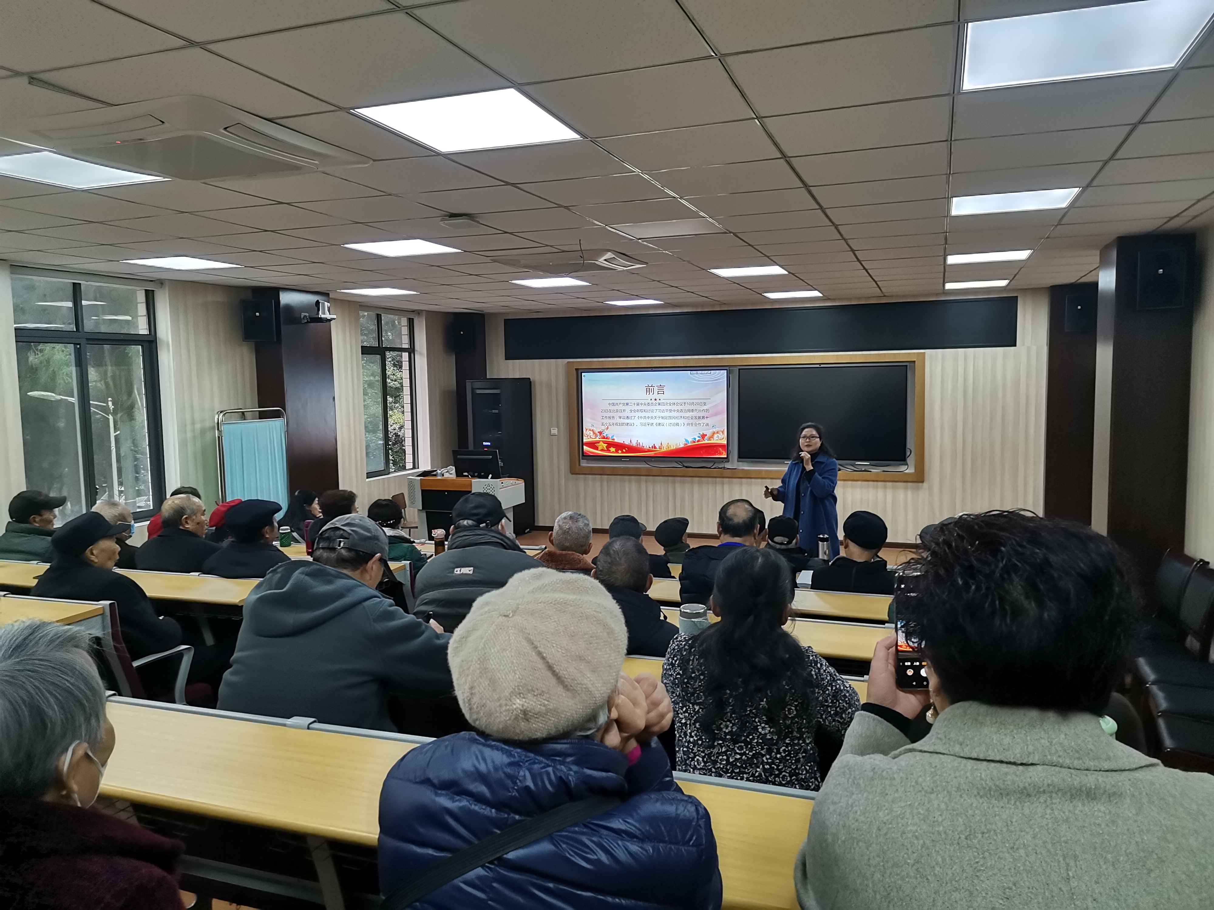 为深入学习贯彻党的二十届四中全会精神,引导学校全体离退休党员切实把思想和行动统一到党中央决策部署上来,12月11日上午,离退休党总支特邀“银耀雅职”老党员工作室主任李霓同志作二十届四中全会精神专题宣讲报告。全体退休党员、党总支工作人员共60余人参加会议。